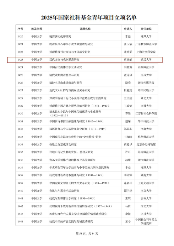 (本网讯:通讯员 张珈利)9月5日,全国哲学社会科学工作办公室公示了2025年国家社科基金年度项目立项名单,我院青年教师黄竞娴的课题“汉代文物与戏剧形态研究”荣获青年项目立项。