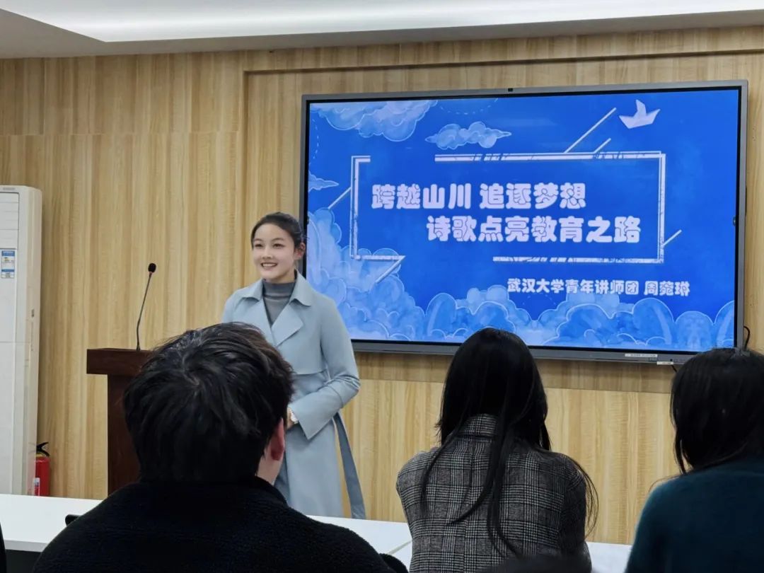 活动中,武汉大学青年讲师团学生讲师、本班团支部书记周菀琳围绕乡村教育振兴,分享了一系列触动人心的故事。周菀琳以“跨越山川 追逐梦想 诗歌点亮教育之路”为主题,讲述了偏远乡村教育工作者的感人实践。在那些教育资源极度匮乏的乡村学校,课余生活枯燥乏味,孩子们的视野受限。然而,一群心怀大爱的教育工作者坚守在这片土地上,为改变现状不懈努力。他们将诗歌教育引入校园,从基础的诗歌赏析起步,一步步引导孩子们拿起笔,书写自己的心声。