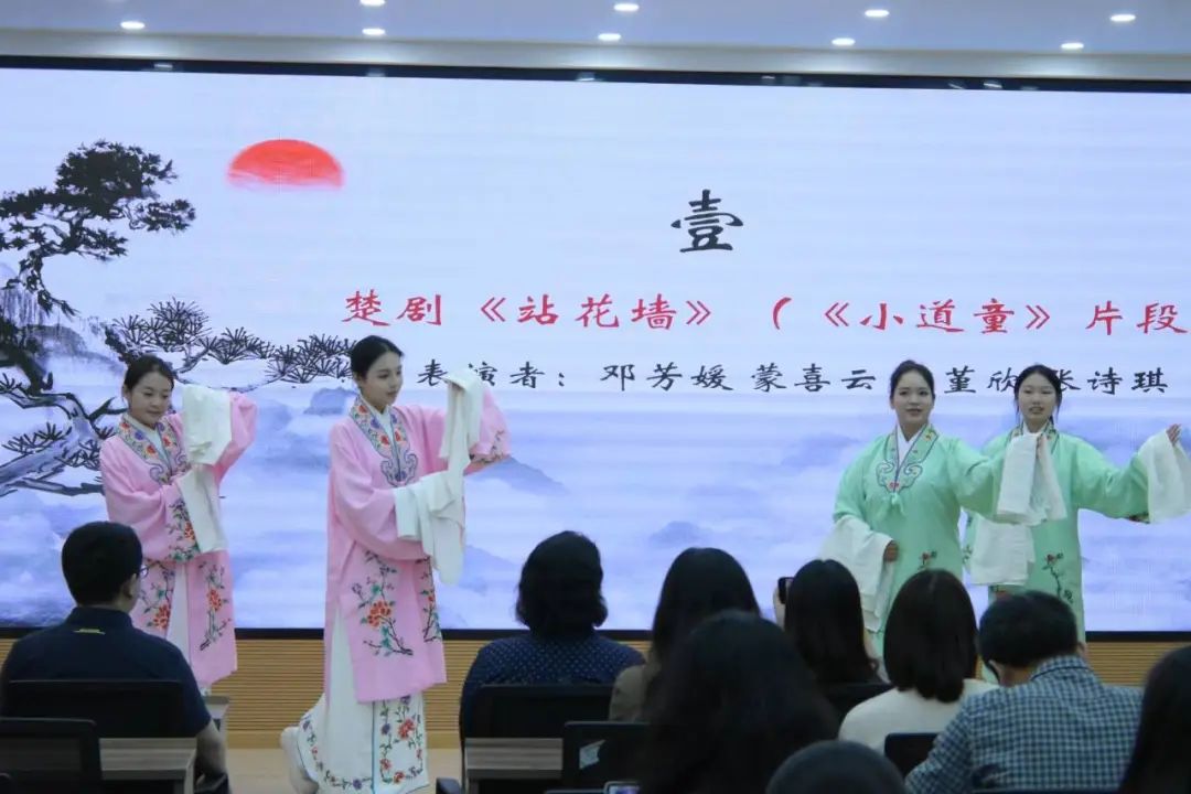 活动伊始,艺术学院本科生党支部带来的楚剧《站花墙》(《小道童》片段)表演,邓芳媛、蒙喜云、方堇欣、张诗琪四位同学以婉转唱腔与灵动身段,展现了荆楚戏曲的独特魅力。楚剧作为国家级非物质文化遗产,承载着千年文化基因,为活动注入了鲜活的文化底蕴。