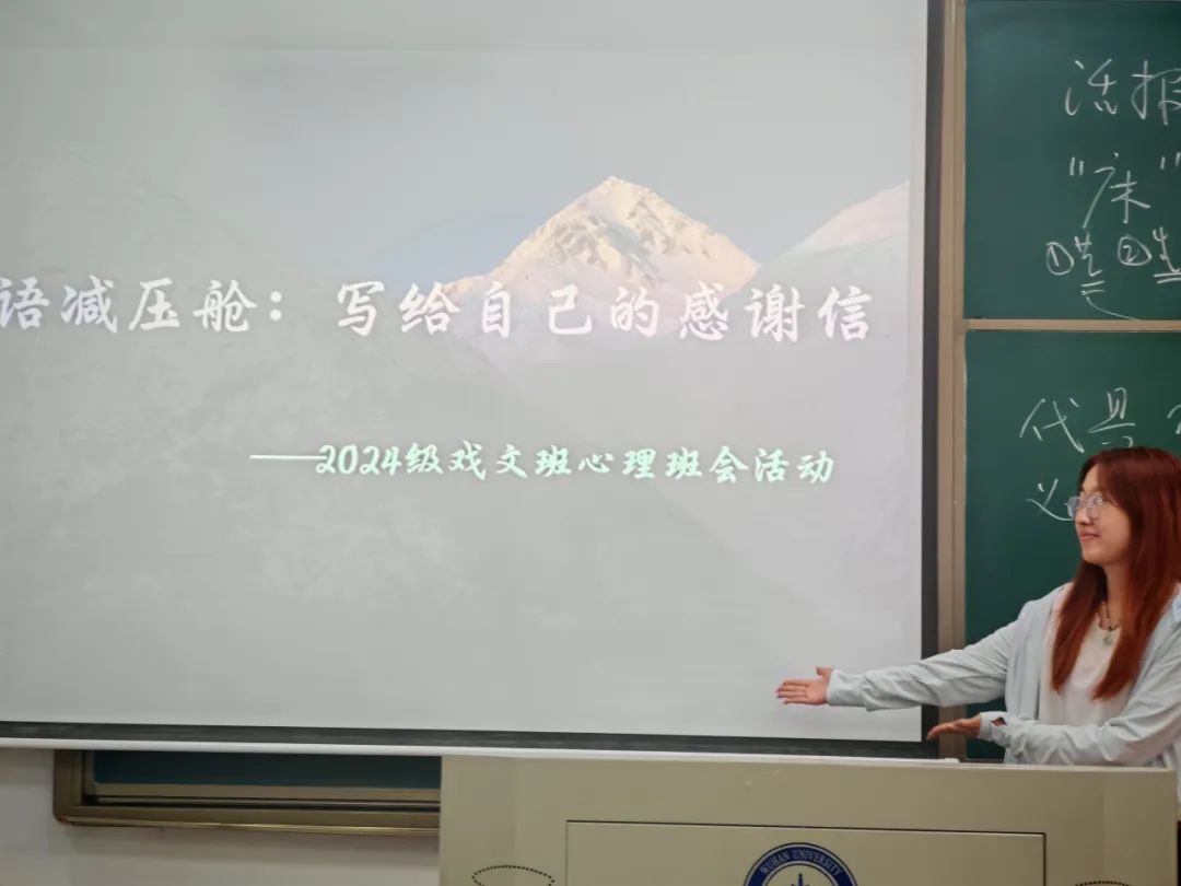 2025年5月8日,在初夏温柔的阳光里,雷火竞技官网进入2024级戏剧影视文学班的同学们化身“心灵治愈师”,于枫园教学楼教室开启了一场特别的“心语减压舱”:“写给自己的感谢信”主题心理班会。这是一场文字与心灵的双向奔赴,同学们通过“倾诉—感恩—展望”的沉浸式体验,用笔墨为情绪松绑,以信笺同自我对话。在书写中梳理成长的烦恼,在分享中传递温暖的力量,让每一封写给自己的感谢信,都成为这个五月最动人的心灵独白。